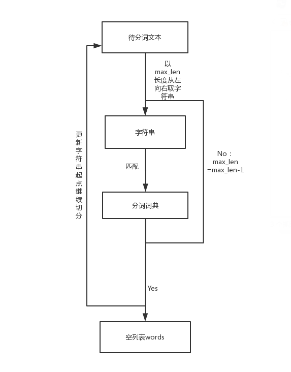 正向最大匹配法(Maximum Match Method,MM 法)是指从左向右按最大原则与词典里面的词进行匹配。假设词典中最长词是 m个字,那么从待切分文本的最左边取 m个字符与词典进行匹配,如果匹配成功,则分词, 如果匹配不成功,那么取 m−1 个字符与词典匹配,直到成功匹配为止。